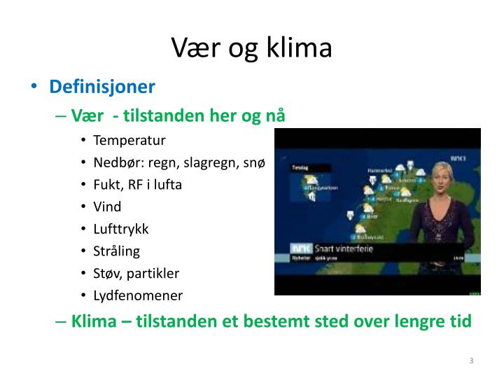 For de som ikke vet forskjellen på vær og klima, anbefaler vi denne presentasjonen fra en forelesning i byggteknikk fra Høgskolen i Gjøvik.